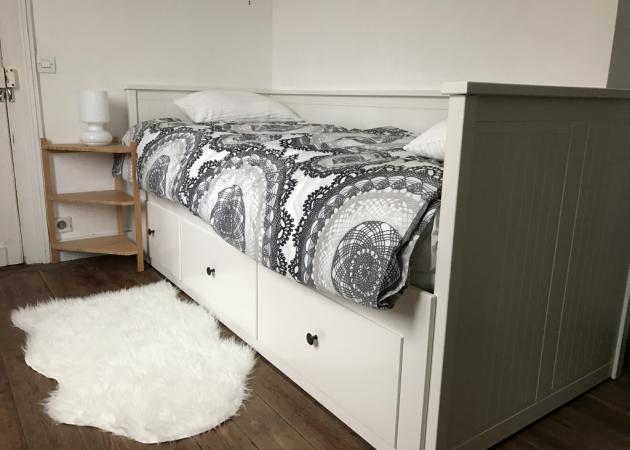 La chambre que nous louons est située à l'entresol entre le rdc et le 1er. Elle est aménagée d'un lit gigogne (90) avec chevet, d'un bureau et d'une armoire et de plusieurs rangement. Nous fournissons les oreillers, couettes, draps, serviettes et wifi!