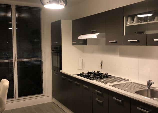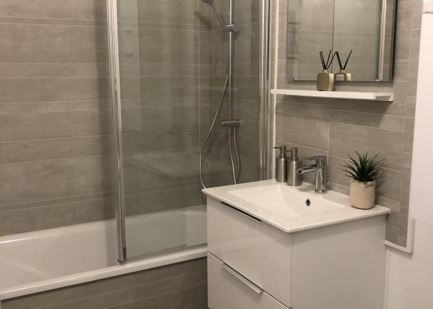 Partie commune de l’appartement : un séjour, une très belle salle de bain, 1 WC , une cuisine toute équipée, deux bureaux individuels pour pourvoir travailler tranquillement et deux très grands placards.