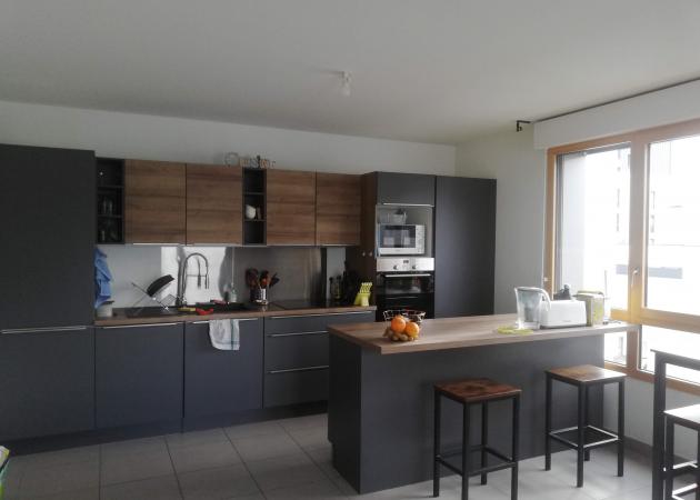 Grande pièce à vivre à partager comprenant salon/séjour et cuisine toute équipée (électroménagers, vaisselle, batterie de cuisine...)