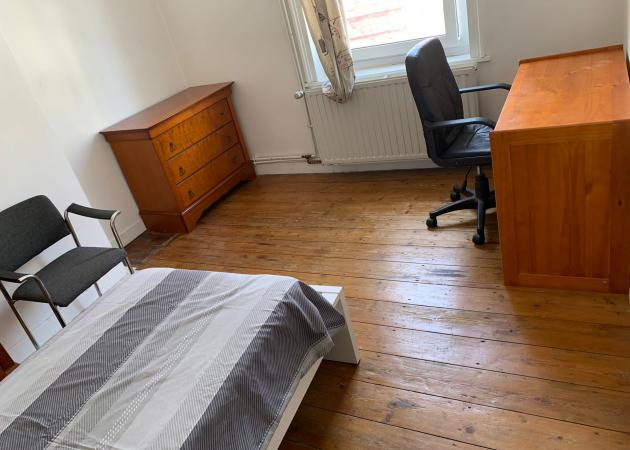 Dans la chambre, vous avez un lit simple, une commode, une table de travail, une table de chevet. La chambre se trouve au deuxième étage