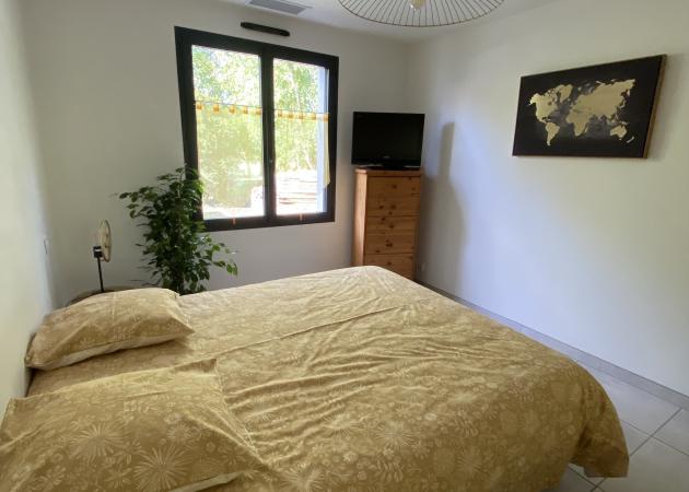 La chambre de 12 m² vous accueille avec un lit spacieux de 160 cm, une télévision pour vos moments de détente, le tout complété par des toilettes et une salle de bain, juste à côté de la chambre. Votre tranquillité est notre priorité.