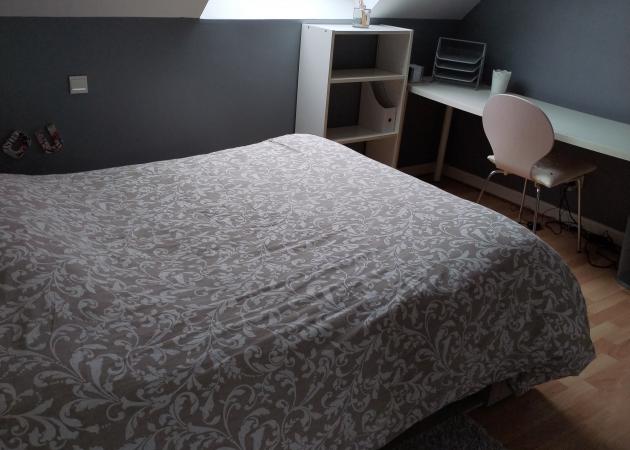 Chambre équipée d'un lit double, d'un bureau, de 2 chaises et d'un placard (penderie et étagères)