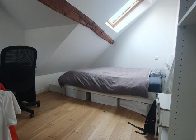 Chambre de 12 m2 sous les toits comportant un lit double, un bureau, une étagère et du rangement sous le lit.