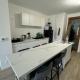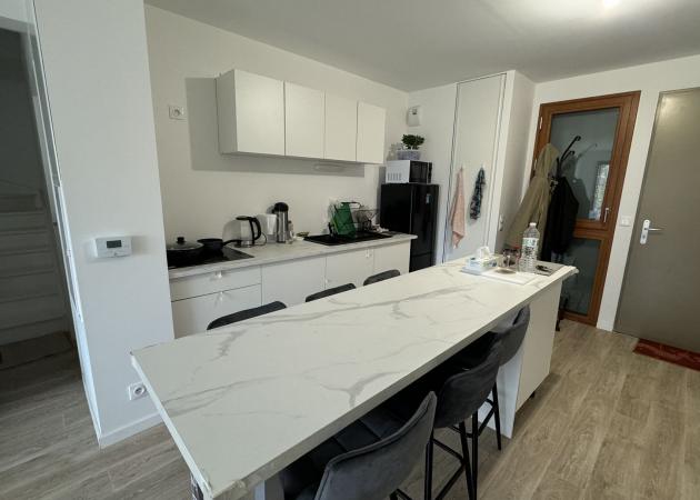 - Une cuisine équipée ouverte sur le salon : plaques de cuisson, hotte, micro-ondes, réfrigérateur, bouilloire, machine à café