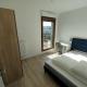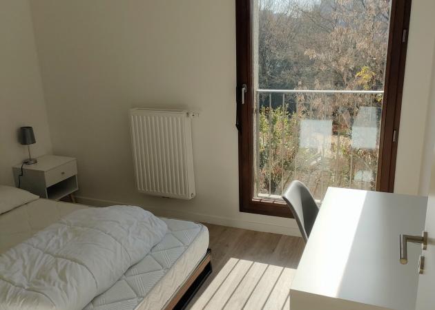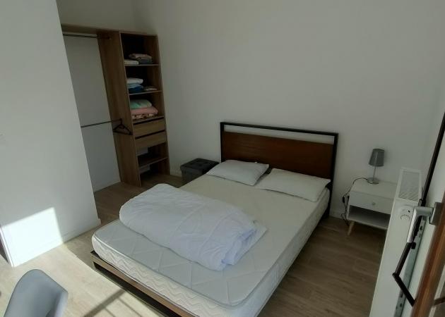 Les chambres lumineuses sont louées avec un lit double, un chevet, un bureau, une chaise, et une penderie.