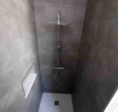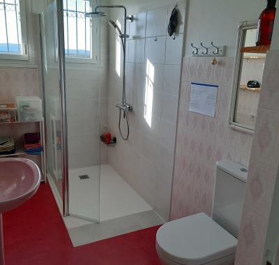 Lit 140 avec coin bibliothèque et TV. Salle de bain douche et