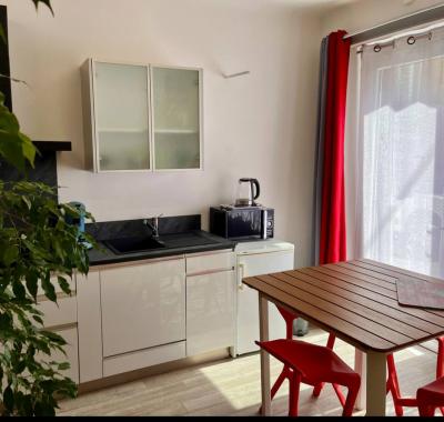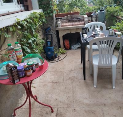 Petit studio de plein pieds avec petite terrasse privative avec table où on peut manger.