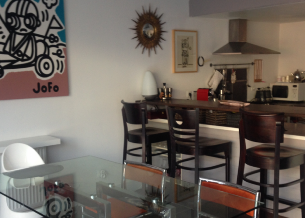 Grand salon de 60m2 avec poêle et cuisine américaine