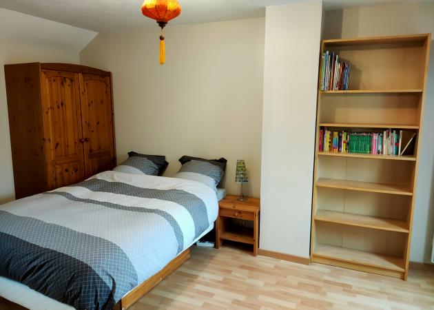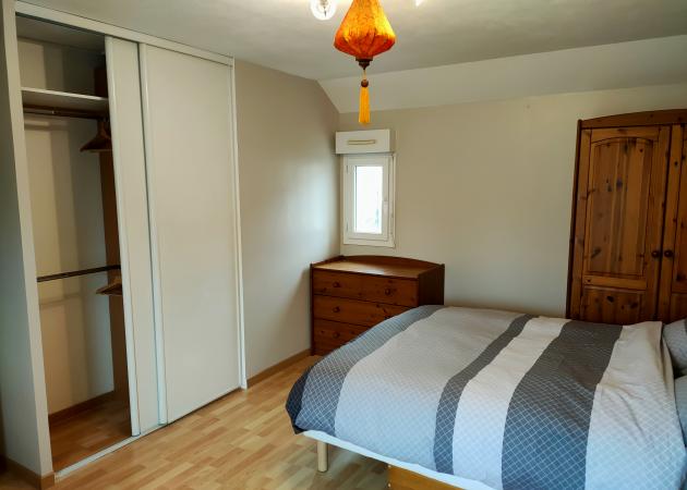 Chambre disposant d'un lit double, d'une armoire, d'un placard, d'une table de nuit, d'un bureau.