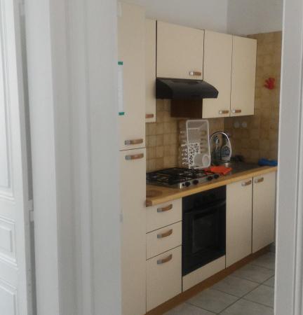 RDC : Entrée, cuisine avec vaisselle, sèche linge, four, plaque cuisson 4 feux, grand Frigo, hotte aspirante, grille pain, cafetière à filtre.