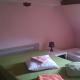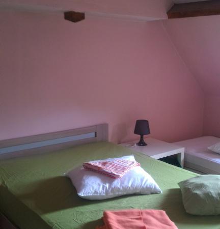 À l'étage : palier, cabinet de toilettes, 4 chambres avec 4 tables, 4 armoires, 4 chaises, 4 grands lits 140 x 190, 4 ventilateurs,