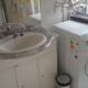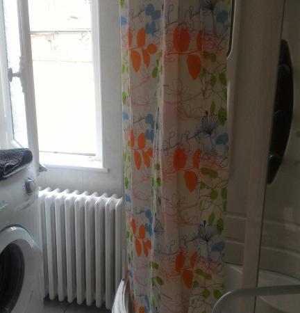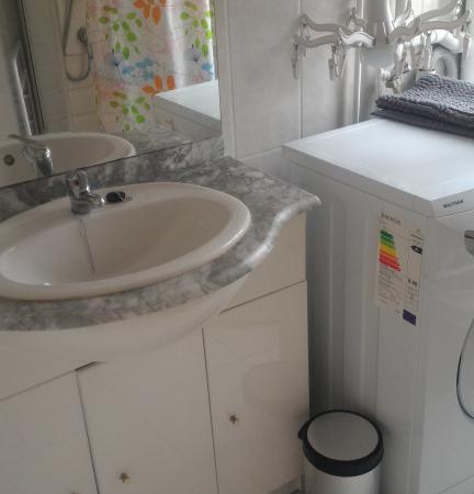 salle de douche : cabine de douche, meuble lavabo, miroir, lave linge.