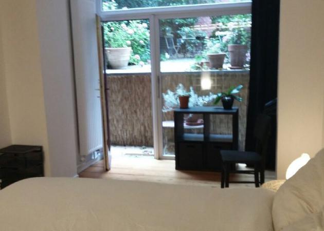 La chambre est d’une superficie de 18 mètres carrés (lit double très confortable de 140) elle est située juste à côté de la salle de bain qui s’ouvre aussi sur le jardin. Très grande indépendance par rapport au reste de l’appartement.