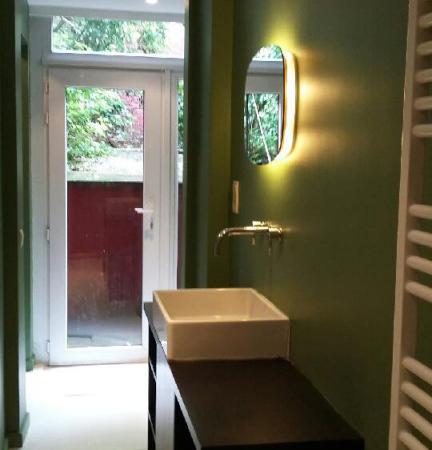 La vaste salle de bain (avec espace laverie et une deuxième toilette) s’ouvre également sur le jardin.