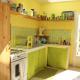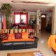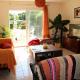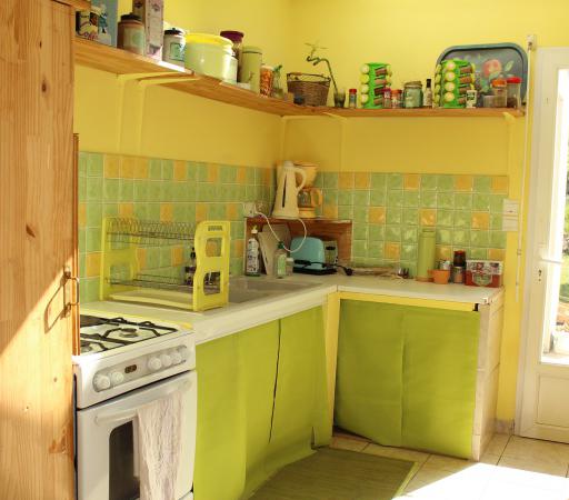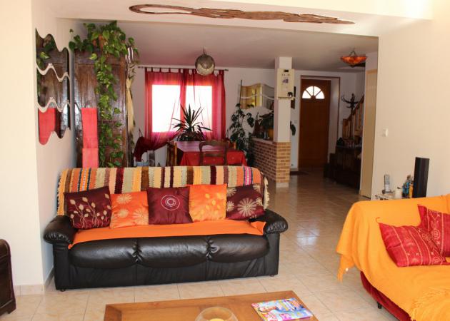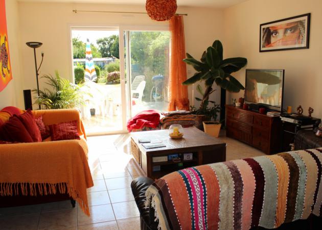 Une grande salle salon très claire avec à côté une petite cuisine donnant sur le jardin
