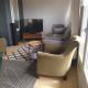 Séjour/salle à manger avec une télévision et balcon, cuisine et une salle de bain avec lave-linge.