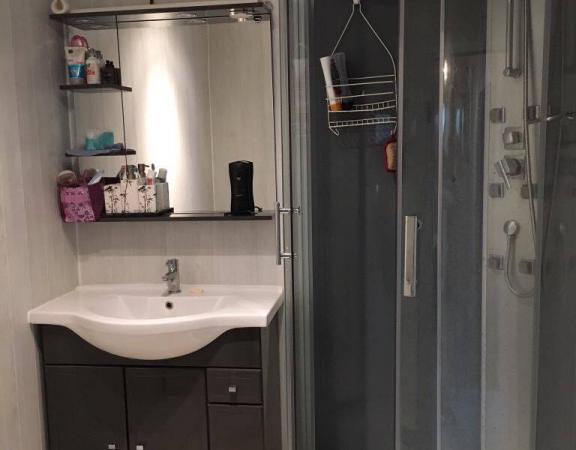 Salle de bain juste à côté ( elle aussi complètement refaite ) ; lambris plastifié sur mur et plafond.