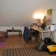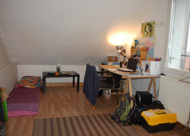 -La chambre : Grande chambre d'environ 18/20m² sous les combles d'une grande colocation. La pièce est meublée d'un lit, un bureau, une étagère, un meuble de rangement et d'un lit d'appoint, habituellement utilisé comme canapé et de deux tables basses (tout ce qui est visible sur les photos). ll y a aussi des enceintes.