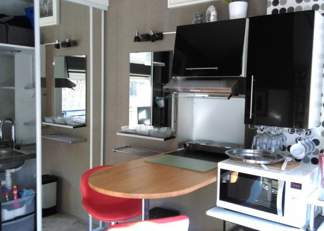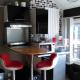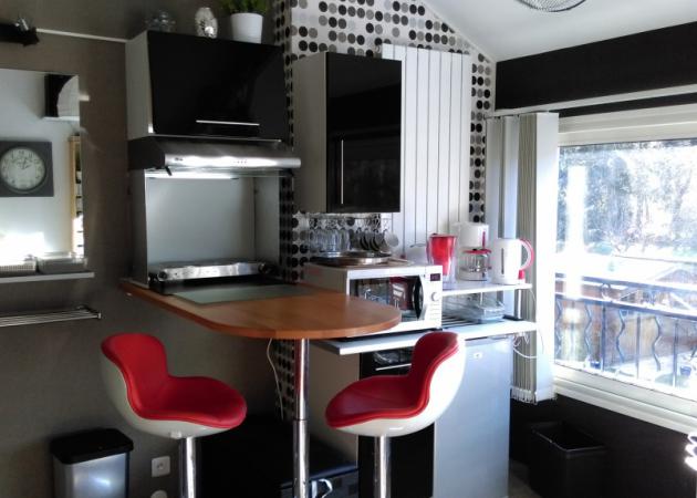 -Coin cuisine avec réfrigérateur top, four multifonction, 2 plaques vitrocéramiques, hotte, bouilloire, grille pain, cafetière, vaisselle de base, évier.