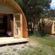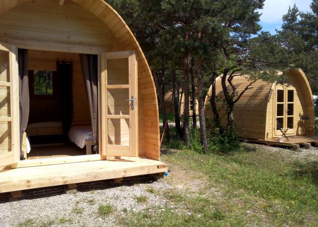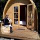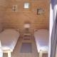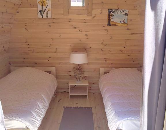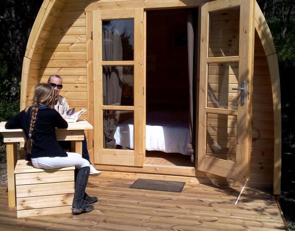 Chambre avec lit double , commode, couette, oreillers, table et tabourets sur terrasse extérieur, radiateur , prises de courant
