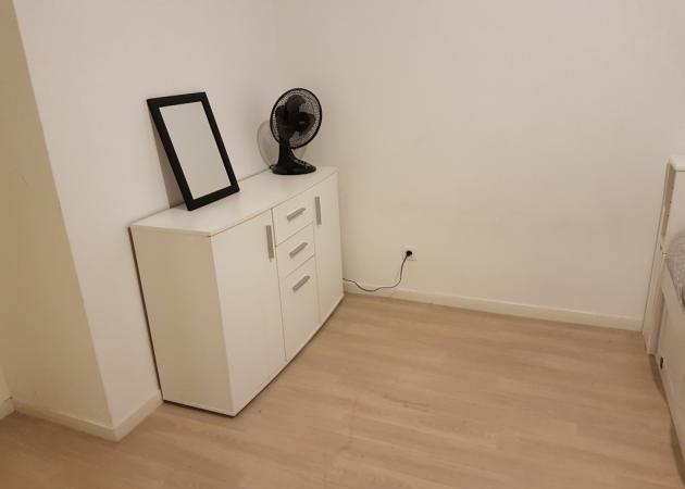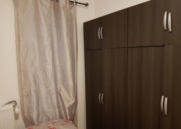 Chambre environ 14m² : grande armoire, lit double place, commode pour rangement, fenêtre donnant sur parking