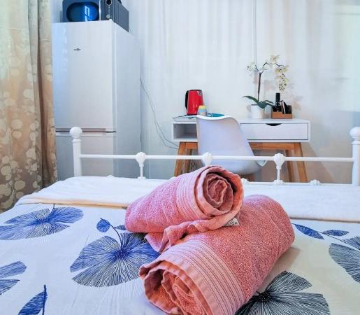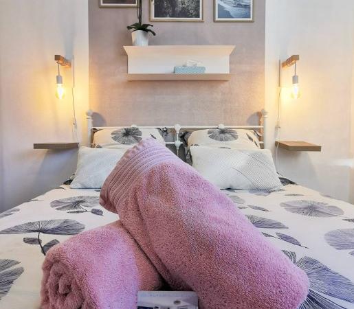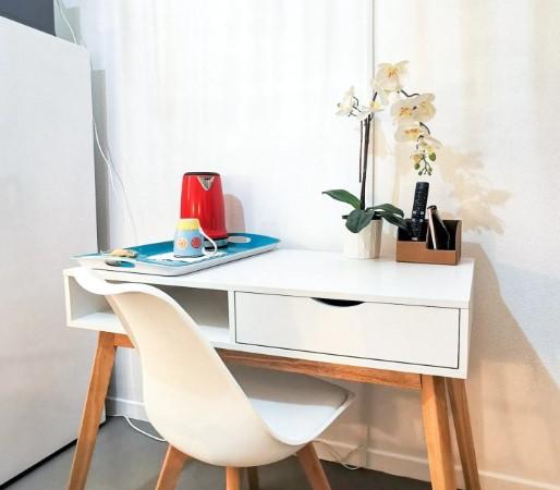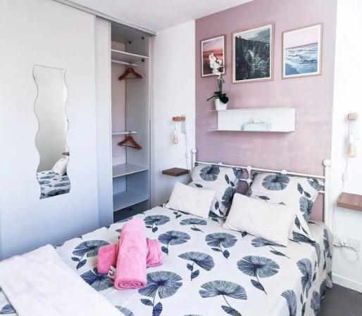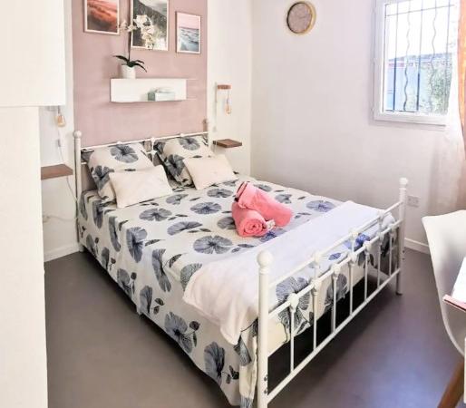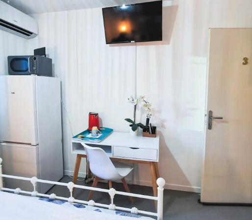 La chambre est équipée d'un grand lit confortable, un placard spacieux, un espace de travail, une télévision connectée avec accès Netflix et Amazon Prime, la climatisation et le chauffage