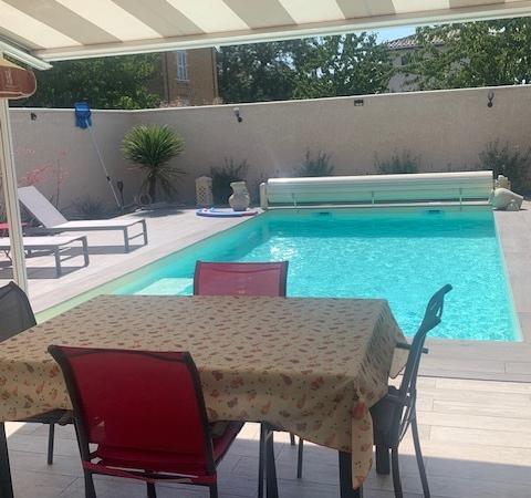 La maison est lumineuse avec un jardin et une belle terrasse et piscine exposées plein sud.