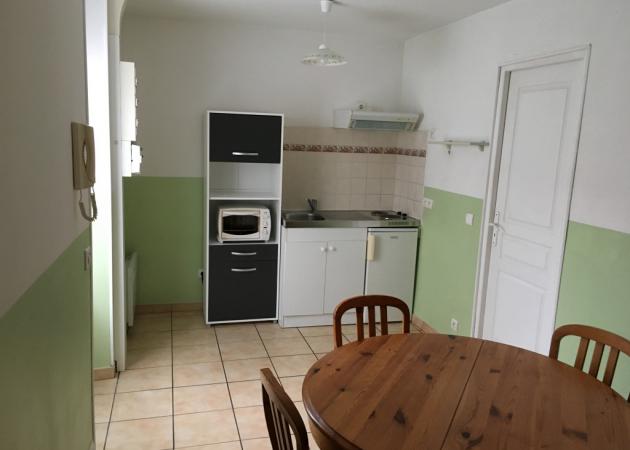 A Tarbes, Quartier de La Gespe, face Lycée Jean Dupuy, loue T1 Bis/T2 de 35 m² semi-meublé comprenant 1 séjour coin cuisine équipée (frigo, évier, 2 plaques électriques, hotte) avec une table + 4 chaises et 1 vaisselier, 1 chambre avec 1 meuble bibliothèque et une armoire étagères et penderie et 1 salle d'eau (avec WC, douche et lavabo).