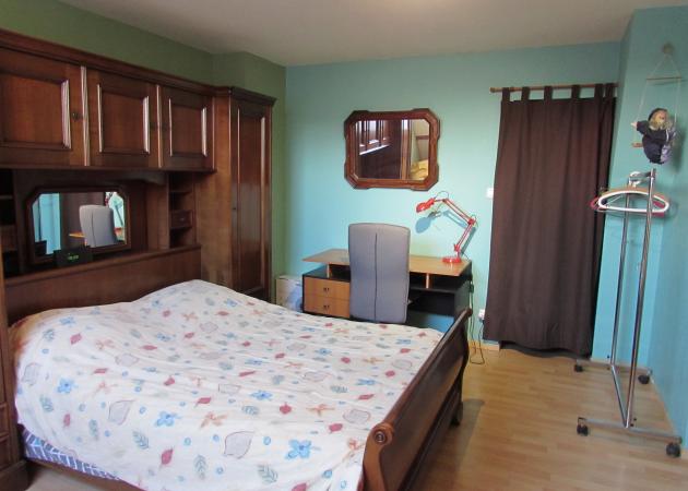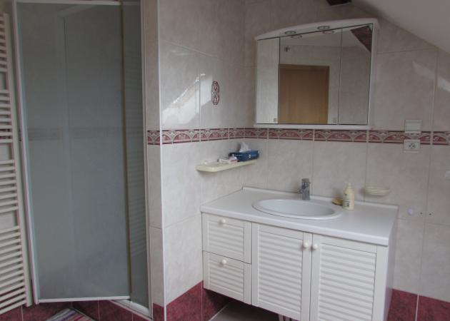 avec un lit de 140 cm, bureau, armoire, rangement, TV. La salle d'eau (douche) avec WC est attenante à la chambre.