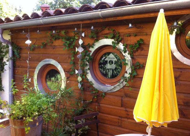 Grande terrasse couverte sur jardin en rdc. Salle de bains en bois, salon tv-video, wi-fi.