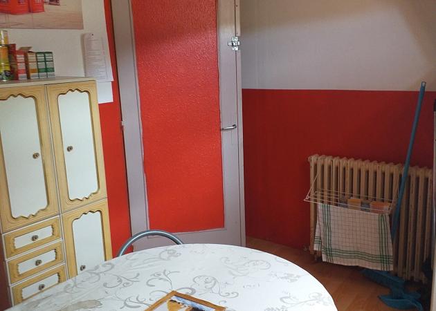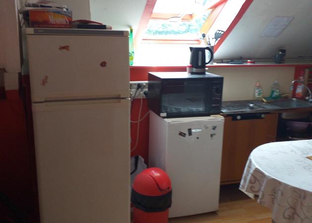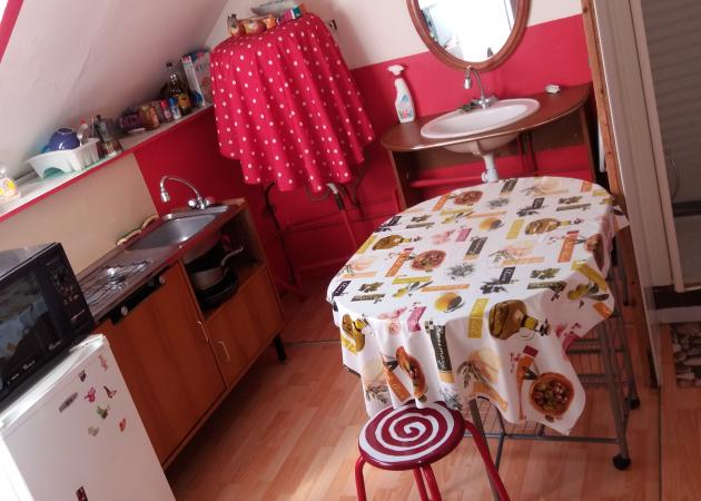 Kitchenette 12 m² tout équipée, gaz, 2 frigos, four micro-onde, table, 4 chaises, vaisselles.