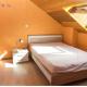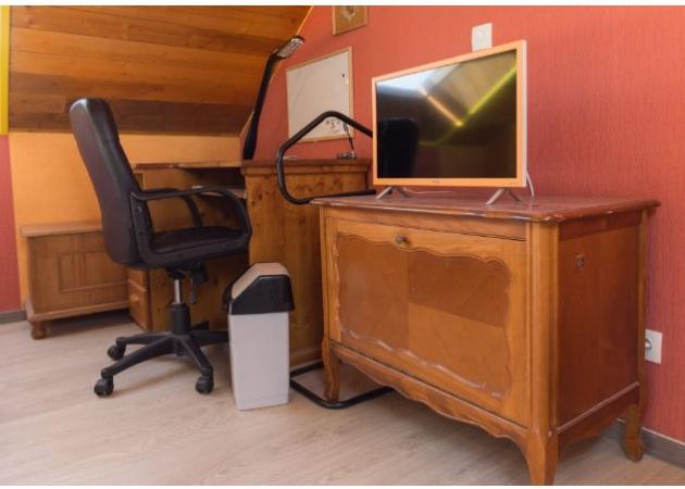 Chambre équipée : lit deux places, télévision, accès Wifi, bureau, armoire, frigo top, micro onde, bouilloire, cafetière senseo.