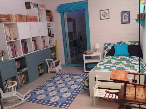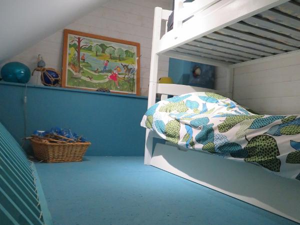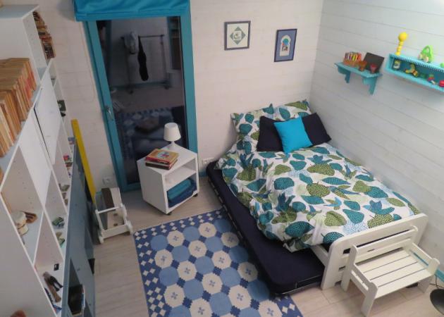 Mer avec un lit double 140x200 en mezzanine (ne convient pas aux PMR et enfants en bas âge ni aux personnes très corpulantes) et 2 chauffeuses 80x180 pour enfants au RDC entrée indépendante par le jardin