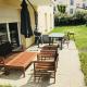 Jardin terrasse avec salon de jardin table chaîne parasol et barbecue ainsi que jeux pour enfants.