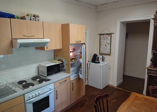 * Cuisine équipé partagée: four, four a micro-ondes, plaque de cuisson, bouilloire, cafetière (senseo), vaisselle, assiettes, bols, sets de table, planche a couper, réfrigérateur et congélateur ustensiles de cuisine etc