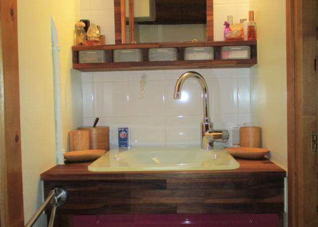 - Cabinet de toilette privé : rangement 2 tiroirs sous vasque + 2 étagères au dessus du wc + nécessaire ménage et produits d’entretien adaptés au lieu à renouveler + poubelle sdb + étendoir et pinces à linge.