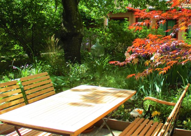 - Terrasse sur jardin en partage : table et chaises + fauteuils + transat + parasol.
