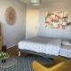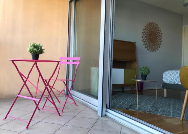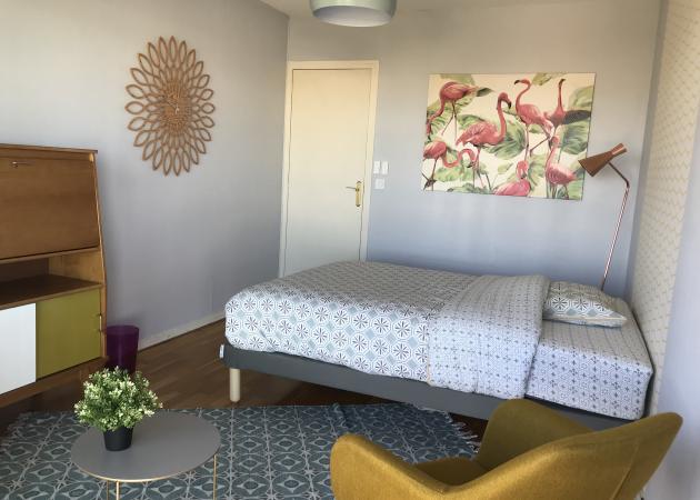 - La chambre avec balcon : 11m2 équipée d’un lit 140x190, bureau et chaise, fauteuil et table basse, table de nuit, lampes, armoire.