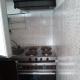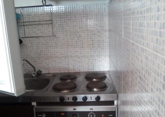 kitchenette avec plaque de cuisson, four, machine à laver, réfrigérateur.