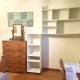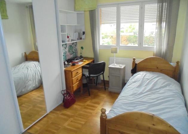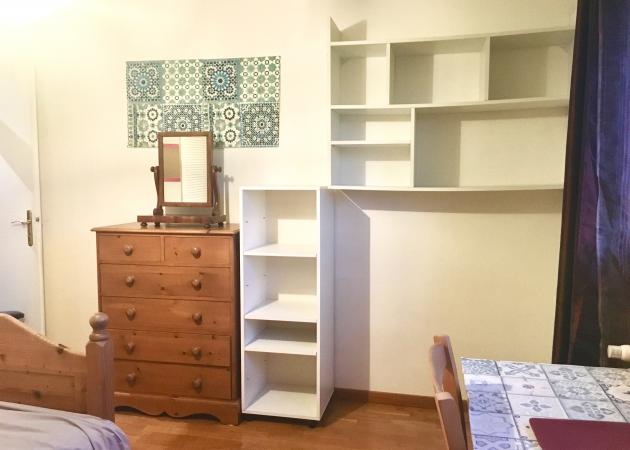 Elle comprend un lit une personne, un grand placard, une commode, un bureau et de nombreux rangements.