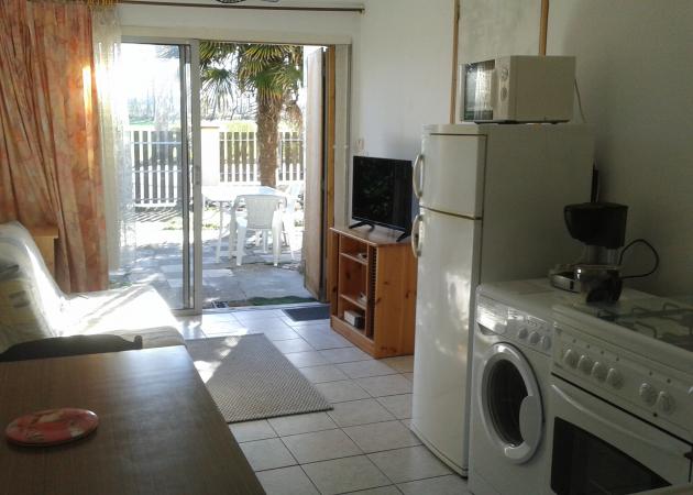 * Devant, au Sud : GRANDE BAIE VITREE = salon avec canapé-lit, LAVE LINGE + FRIGO-CONGELATEUR + CUISINIERE, micro-onde, INTERNET, sel, poivre, huile...