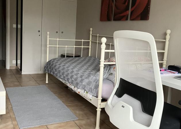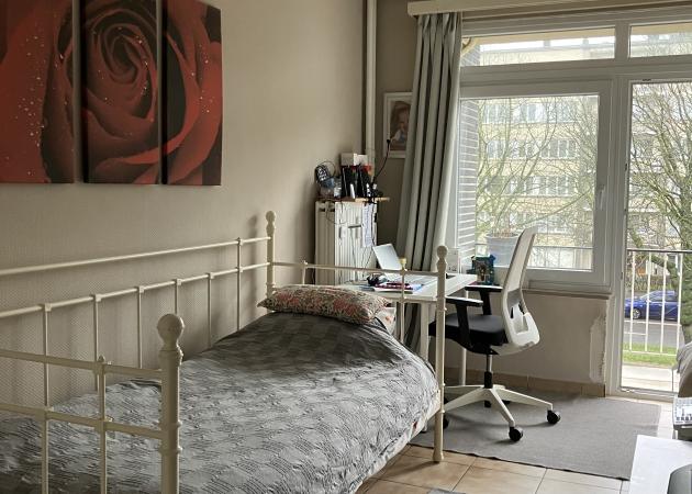 Dans un appartement d'environs 105m², chambre chez l'habitant, lumineuse et meublée (garde-robe, lit, bureau, balcon) située au 2ième étage avec lift et à proximité de toutes les facilités (bus, métro, magasins, ring Ouest (=périph.), centre-ville à 4 stations de métro, ...)