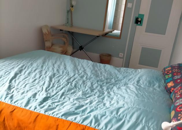 Une chambre lumineuse de 15 m2, avec vue sur le jardin, avec un lit 2 personnes (140 x 190), rangement et bureau.