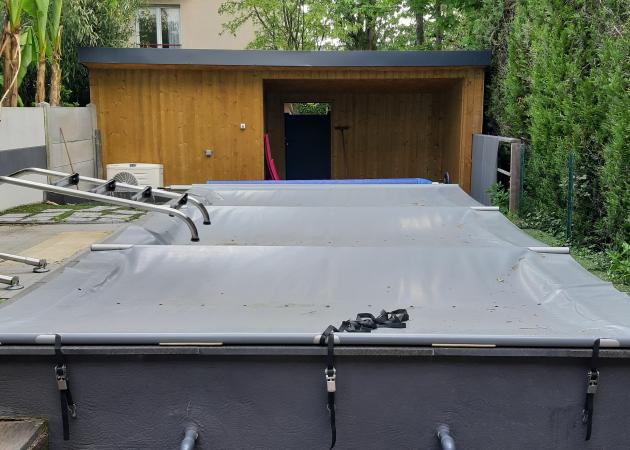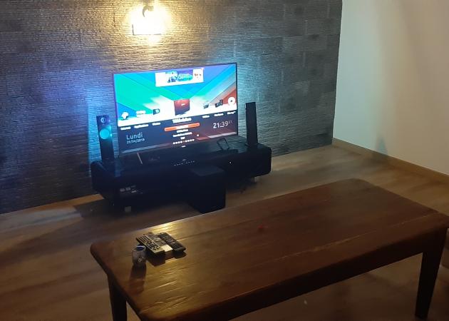 Salon avec coin TV. Espace extérieur avec piscine. Salle de bain et WC.