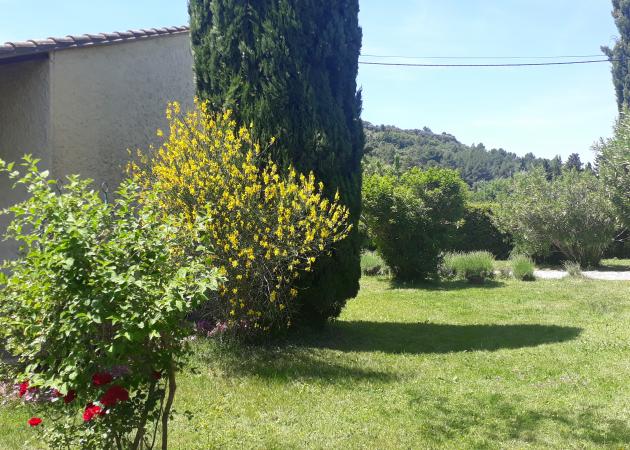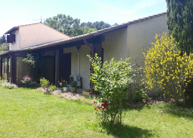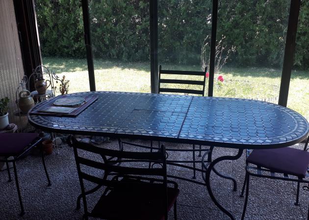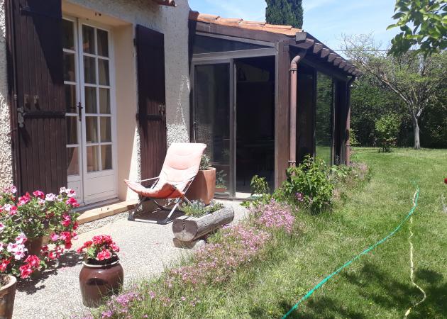 Une terrasse couverte qui donne sur le jardin avec véranda.