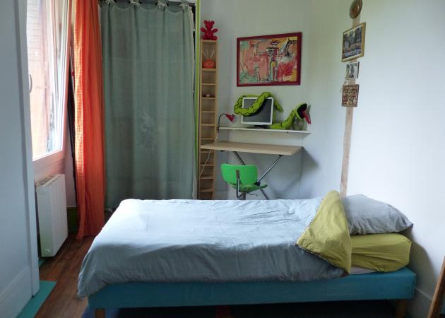 Une chambre lumineuse de 13 m2, avec vue sur le jardin, avec un lit d'1 personne (90 x 190), rangement et bureau.