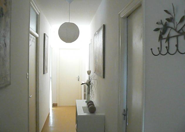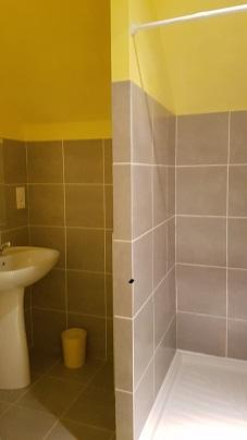 Petite salle d'eau attenante et salle d'eau avec douche et toilettes dans le couloir.
