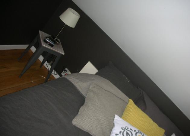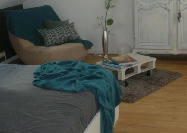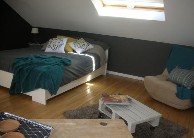 Chambre de +ou- 30 m² avec 1 lit 2 pers (1.60m), petit salon,
