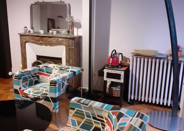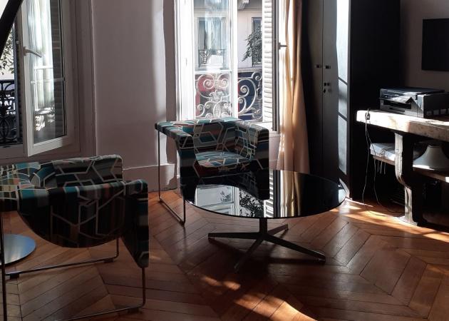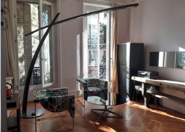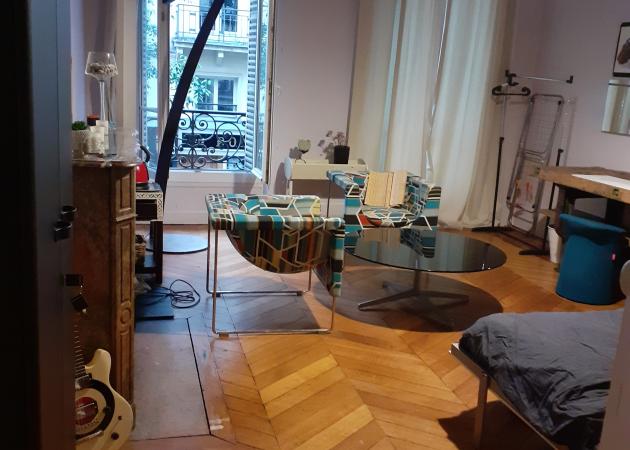 La surface permet de garder le lit déplié et de bénéficier d'un petit coin salon ( 2 fauteuils + table basse )+ un bureau (table design esprit atelier )