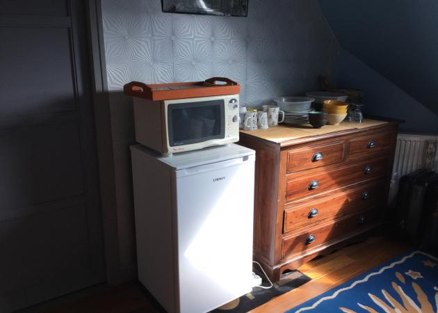 Attenante à la chambre pièce équipée d’une table , d’un frigo , micro onde et vaisselle.